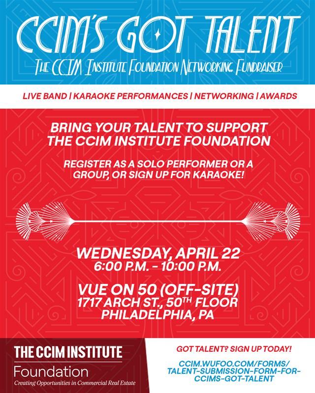 On April 22, 2026, The CCIM Institute Foundation will host CCIM’s Got Talent, a special fundraising event designed exclusively for Spring Forum attendees. Hosted off-site at VUE on 50, this ticketed add-on experience will bring together the CCIM community for an evening of live music, karaoke performances, networking, and purposeful philanthropy.